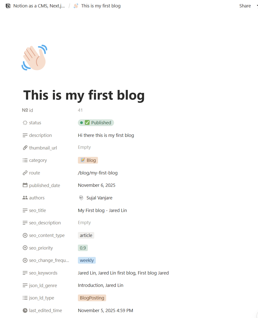 The blog system is fully connected to your Notion database - everything you write or edit in Notion automatically updates on your live site.
