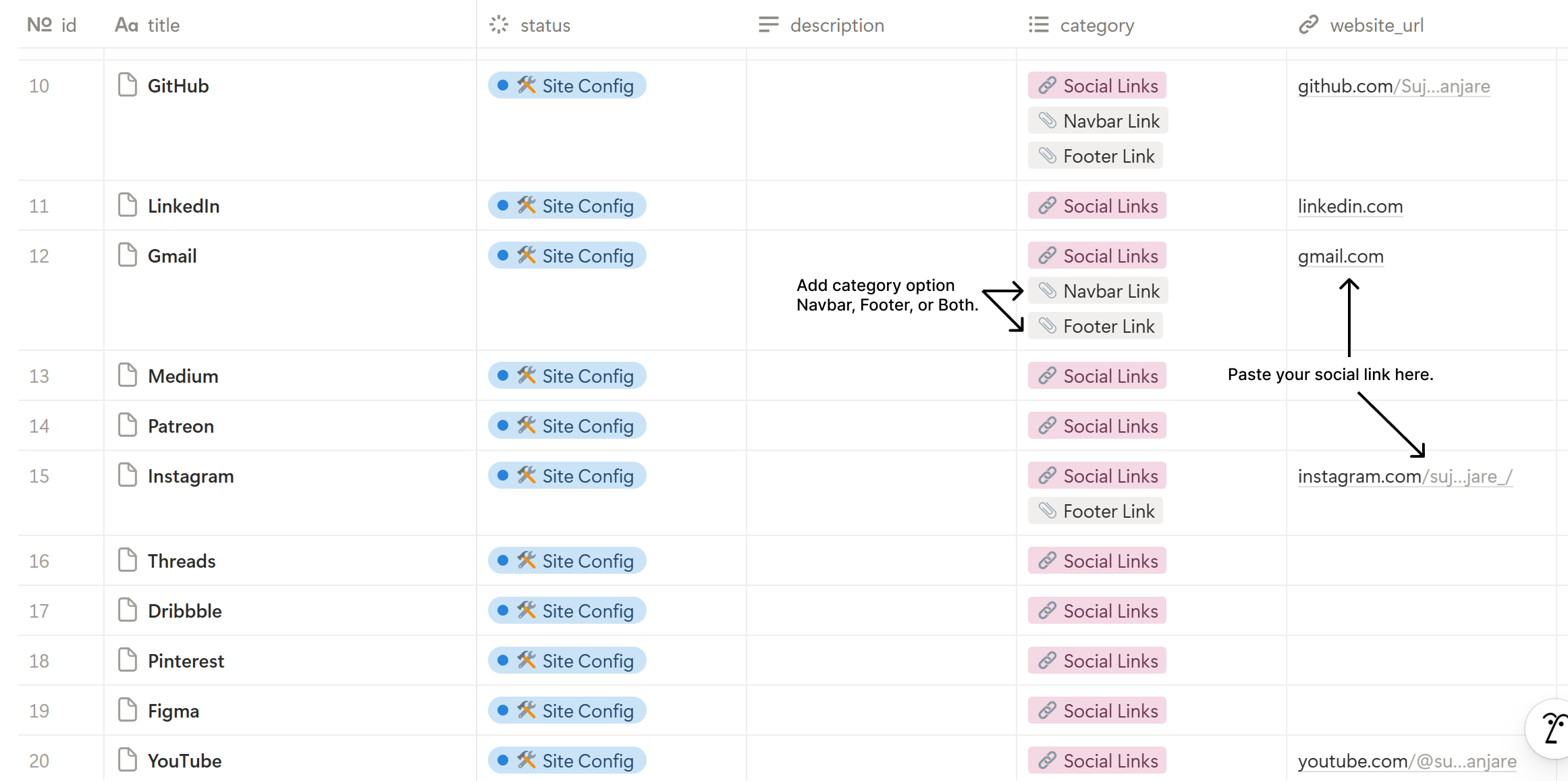 Every row with the category Social Links represents one social profile.